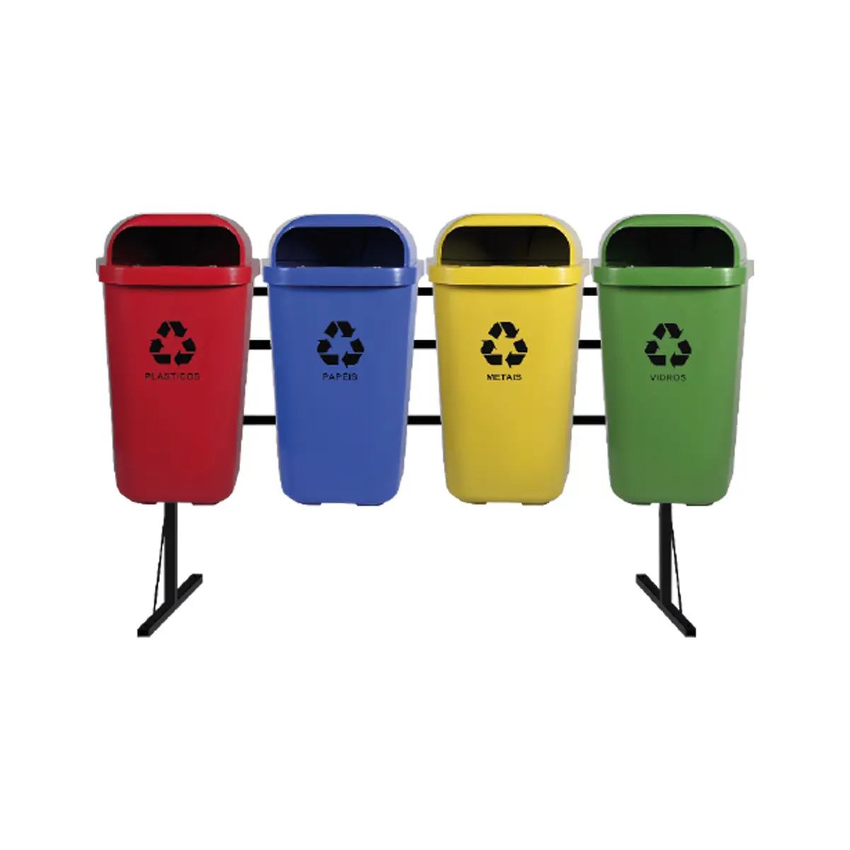 As lixeiras são produzidas em Polietileno de Alta Densidade (PEAD) ou Polipropileno (PP) e contam com estrutura metálica em tubo de aço carbono retangular, garantindo maior resistência contra impactos, raios solares e lavagens frequentes.
