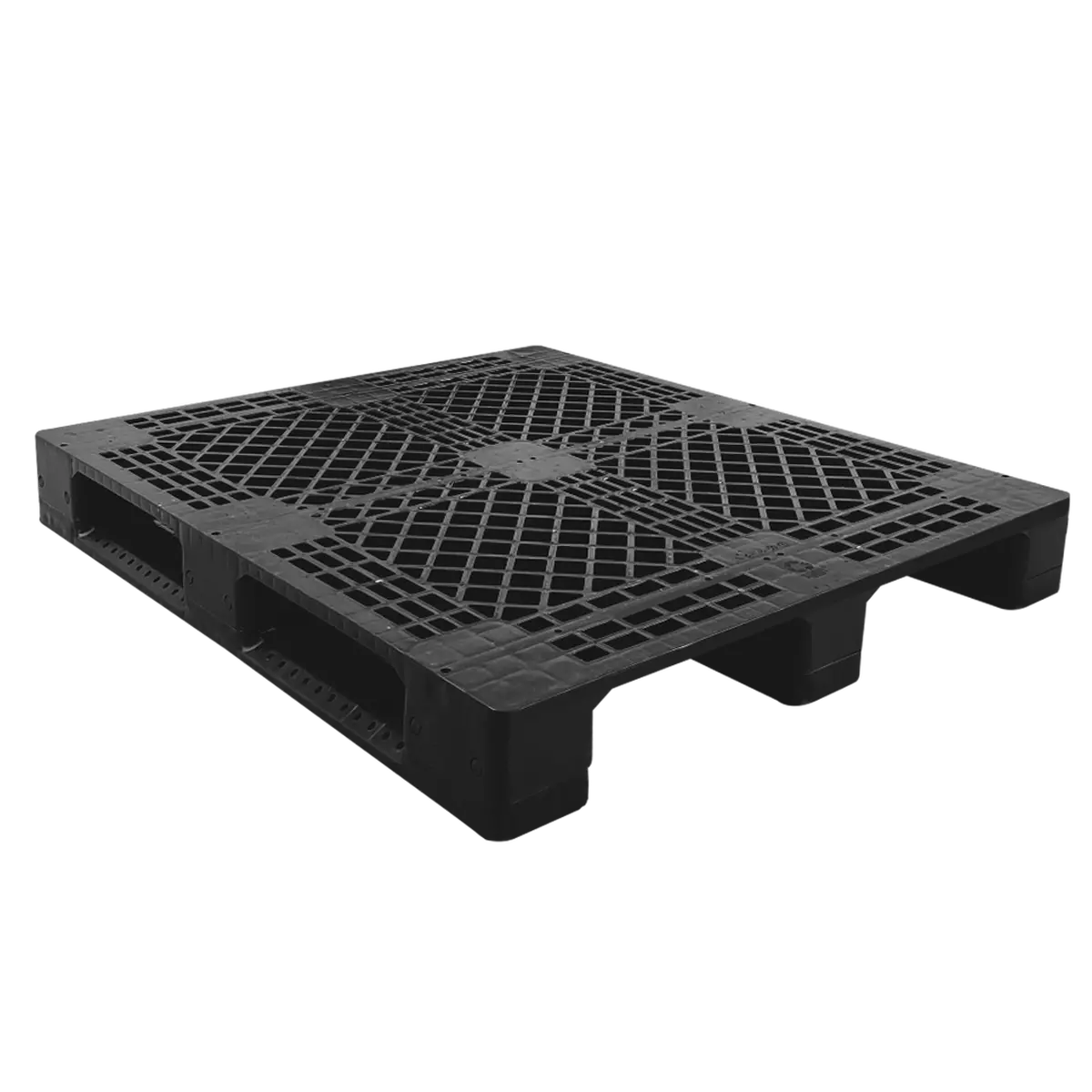 Pallet plástico com superfície vazada e 3 runners reforçados, projetado para facilitar o transporte e a estocagem de produtos em paleteiras, empilhadeiras e sistemas de rack. Seu design versátil atende desde operações logísticas intensivas até aplicações específicas em ambientes controlados.